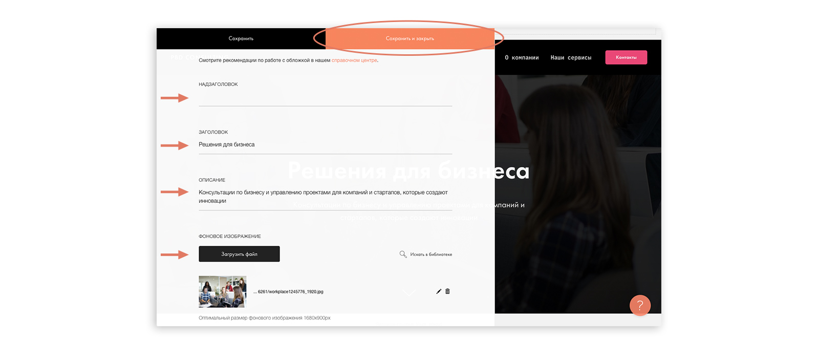 Вставте ваш текст в соответствующие поля, а также загрузите новые изображения. После чего нажмите на кнопку «Сохранить и закрыть».