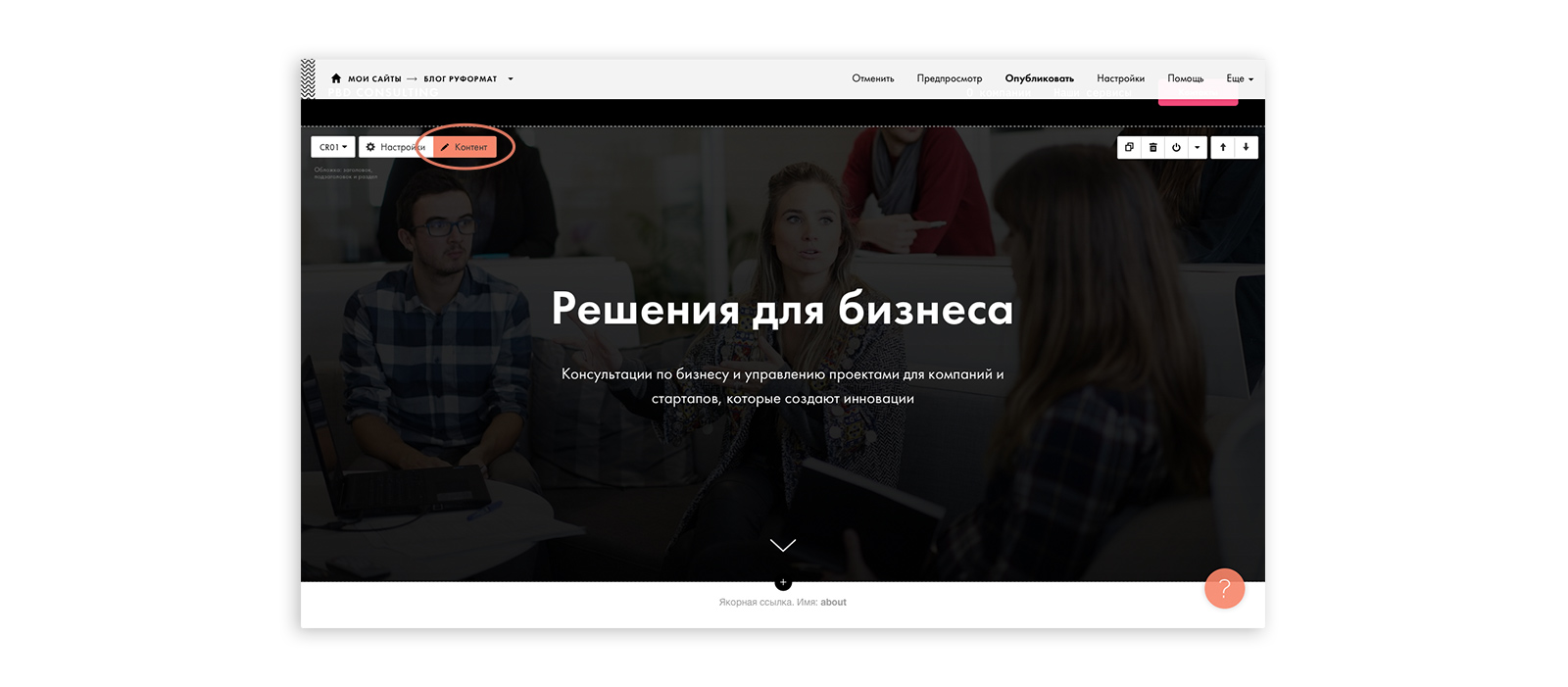 Для того, чтобы заменить текст и картинки в готовых блоках, нажмите на кнопку «Контент».